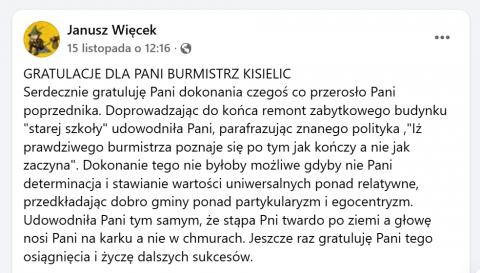 Opublikował post czołobitny i pochwalny pod adresem Pani burmistrz Beaty Lejmanowicz.